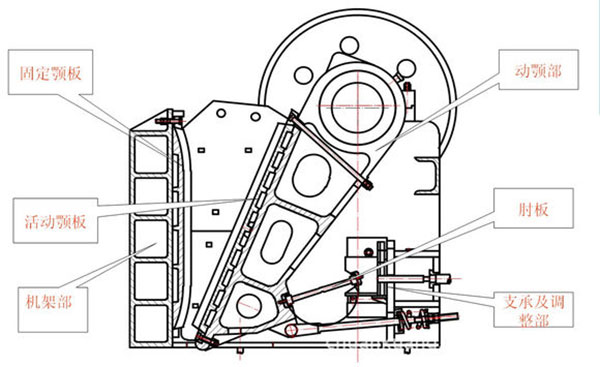 1.机架机架是上下开口的四壁刚性框架,用作支撑偏心轴并承受破碎物料的反作用力,要求有的强度和刚度,一般用铸钢整体铸造,小型机也可用铸铁代替铸钢。大型机的机架需分段铸成,再用螺栓牢固链接成整体,铸造工艺复杂。自制小型颚式破碎机的机架也可用厚钢板焊接而成,但刚度较差。 2.颚板和侧护板定颚和动颚都由颚床和颚板组成,颚板是工作不分,用螺栓和楔铁固定在颚床上。定颚的颚床就是机架前壁,动颚颚床悬挂在周上,要有的强度和刚度,以承受破碎反力,因而大多是铸钢或铸铁件。