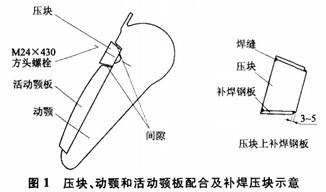 4、过滤器中冷却水的压力高于给油系统中油的压力或冷却水管漏水导致水进入给油系统中,解决此类问题的办法是:控制冷却水的压力低于给油系统的压力至少0.05Mpa;日常也要经常检查冷却水管,及时修复漏水处; 5、活动颚板松动与动颚产生“嘭嚓”的撞击声当压紧活动颚板的楔形压块的楔面已磨损,不能紧密压住活动颚板时,就会产生此类撞击声。如图1所示,压块的底面已顶到动颚面,而它的上下楔面与动颚及活动颚板的楔面仍存在的间隙,机器运转时,活动颚板就会上下窜动,碰撞动颚。此时可以在压块的上下楔面上补焊适当厚度的钢板,如下图所示: