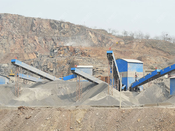 岩石在喂料机的作用下,被匀称的送入颚破进行破碎破碎,破碎后的岩石由传送机送入反击破进行二级破碎,破碎后的岩石经过矿山振动筛进行筛选分级,不达标的返回持续破碎,达标的物料经过矿山振动筛分成0-5毫米、5-10毫米、10-20毫米石子,在传送机的作用下被送入成品堆。