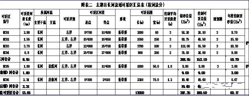本次规划划定的6处可采区累计可采长度13.06km。按河流区分:其中长河干流可采区4处,可采河段长度8.95km;支流冶溪(前铺)河可采区1处,可采河段长度1.8km;支流店前(后铺)可采区1处,可采河段长度2.31km。