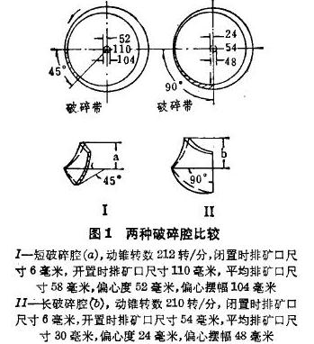 圆锥破碎机出料粒度如何调小? 1、选用合适的破碎腔的几何形状和运转参数 在圆锥破碎机中,处理能力和产品粒度的大小是由破碎腔中两个主要机械因素所决定的:一是破碎锥的锥角、形状和长度;二是动锥运转的偏心矩和运转速度。 图1所示的圆锥破碎机两种几何形状的破碎腔断面,都是目前在生产中应用的。当把这两种形式的圆锥破碎机都用于细碎,给矿的上限粒度为30毫米,且排矿口尺寸也相同。我们将看到,II型(小偏心距、长破碎腔)比I型(大偏心距、短破碎腔)产品细些。