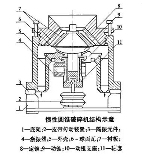 多缸液压圆锥破其特点是破碎力大、高摆频、产量高、产品粒度和粒型好,既可以作为中碎,也可以用作细碎、细碎设备,破碎效果很好。 单缸和多缸液压圆锥破分析在破碎性能上,综合而言,多缸液压圆锥破碎机要高一些,其破碎力、破碎比都大,排料调节范围宽,在调整产品级配上有较大的灵活性。在性能、破碎产品质量上都优于单缸圆锥破碎机。但在整个工艺流程中选用单缸还是多缸,要视整个流程排布而定。 如要破碎比大,可采用多缸液压圆锥破碎机,以减少破碎段数,系统投资,其针片状含量一般在15%以下;如破碎硬岩,可选用多缸液压圆锥破碎机;破碎一般岩石,可选用单缸液压圆锥破碎机。 5、惯性圆锥破惯性圆锥破的破碎原理独树一帜,是一种细节能破碎设备,具有良好的“料层粉碎”作用,开路破碎产品粒度为毫米级,可满足“多碎少磨”新工艺的要求,大破磨流程的能耗和钢耗。